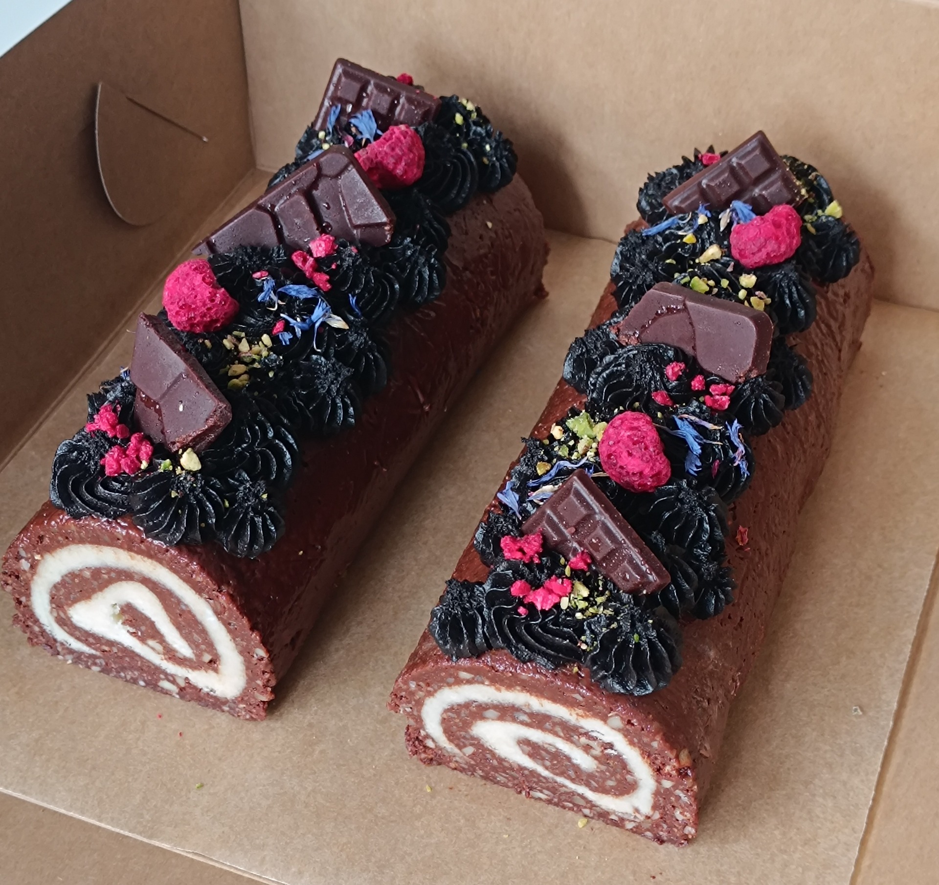 Rumová roláda je plná ořechové chuti, uvnitř s rumovým krémem a zdobená černým kešu krémem, sušeným ovocem a čokoládkami.
